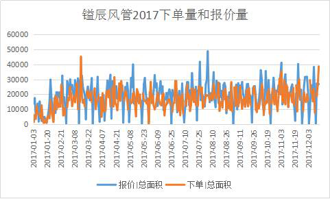 據鎰辰風管報價團隊數(shù)據顯示,2017年11月3日當日鎰辰風管下單量、報價量均創(chuàng)新高,分別達3.55萬㎡和5.06萬㎡,2017年12月13日,風管量再創(chuàng)新高,風管下單量達3.87萬㎡!根據市場調查,市場上風管廠家月風管銷量為5萬㎡-10萬㎡左右,而鎰辰一日的風管銷量相當于其他廠家大半個月的銷量!