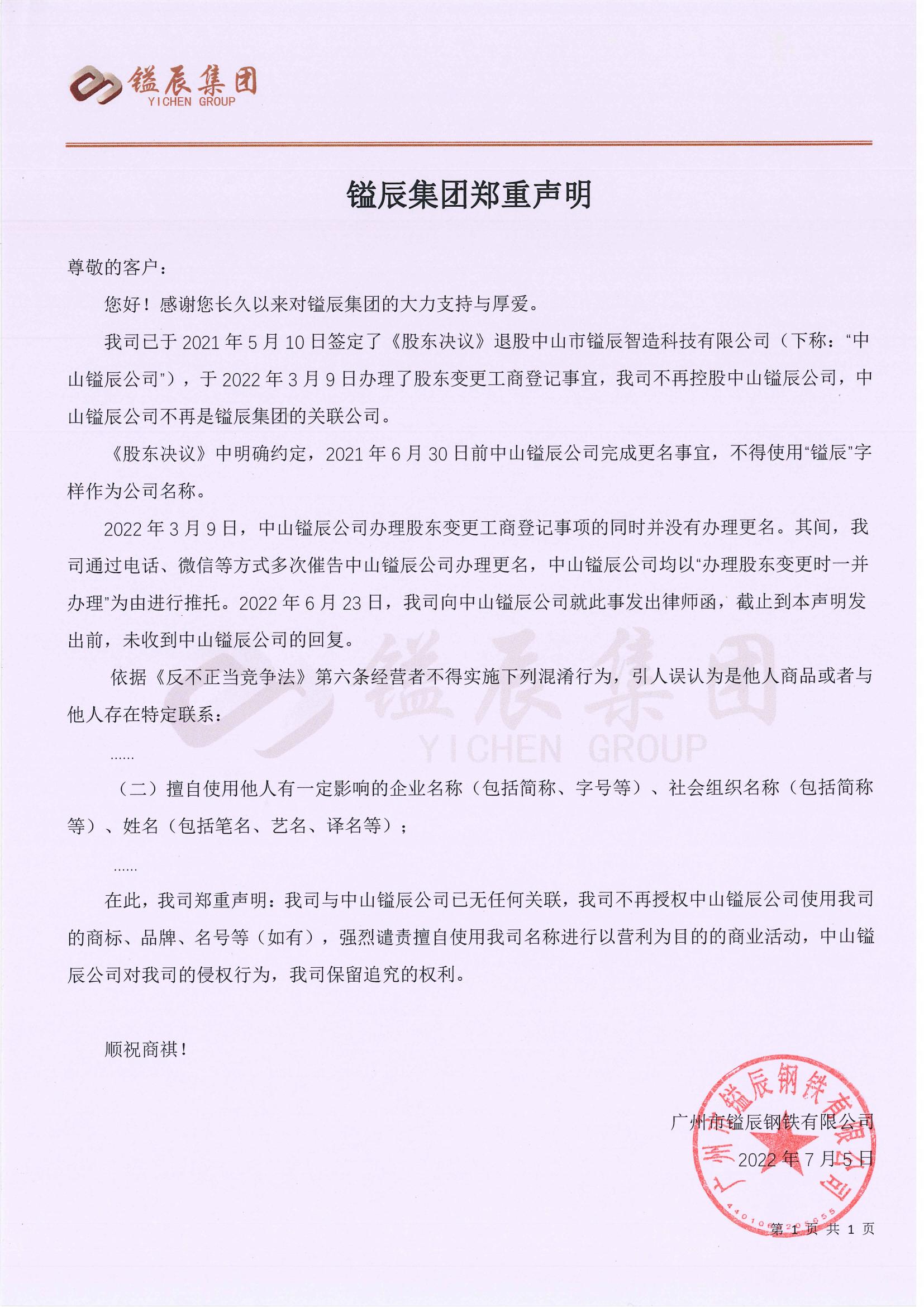 鎰辰集團(tuán)退股中山鎰辰聲明